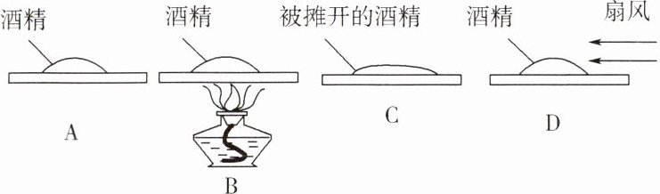 (1) 实验过程:在四块相同的玻璃板上各滴一滴质量相同的酒精,如图所示: