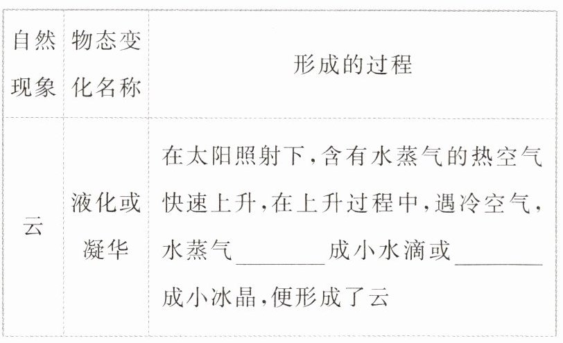 |云|液化或凝华|在太阳照射下,含有水蒸气的热空气快速上升,在上升过程中,遇冷空气,水蒸气液化成小水滴或凝华成小冰晶,便形成了云|