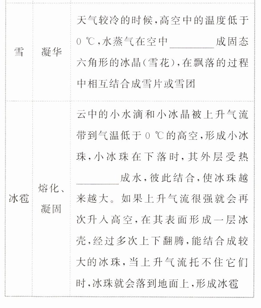|雪|凝华|天气较冷的时候,高空中的温度低于 $0^{\circ}C$,水蒸气在空中凝华成固态六角形的冰晶(雪花),在飘落的过程中相互结合成雪片或雪团|