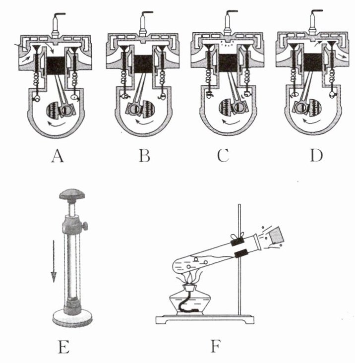 13. 如图所示,图A、B、C、D是四冲程汽油机的工作示意图,图E、F是演示实验的示意图。图C是