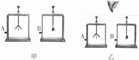 1. 实验:取两个相同的验电器A和B,使A带负电,B不带电(图甲)。用金属杆把A和B连接起来,判断A、B的金属箔张开的角度有什么变化(图乙)。