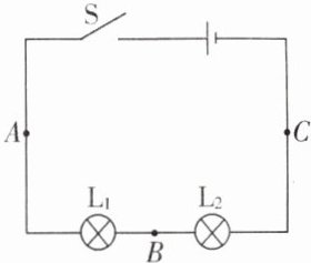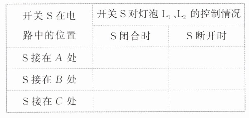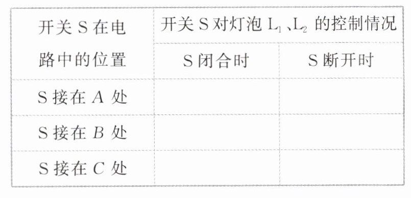1. 在串联电路中,如图所示,改变开关在电路中的位置,分别接在A、B、C的位置,闭合开关,观察两个灯泡的发光情况,填入表中: