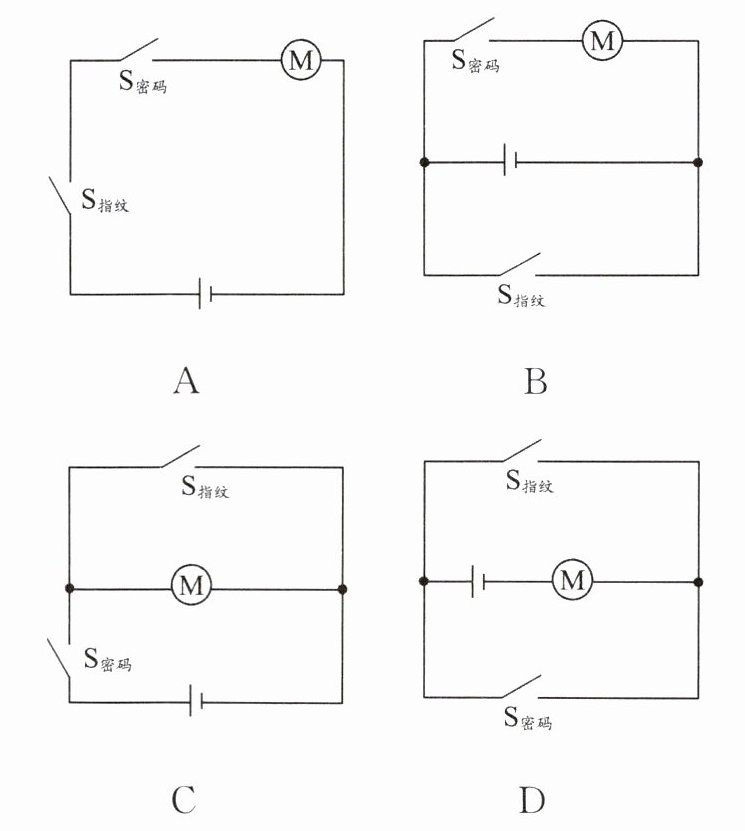 10. 很多家庭都安装了智能门锁,按指纹或输入密码都可以启动电动机打开锁扣,实现开门的功能。下列电路图符合要求的是(