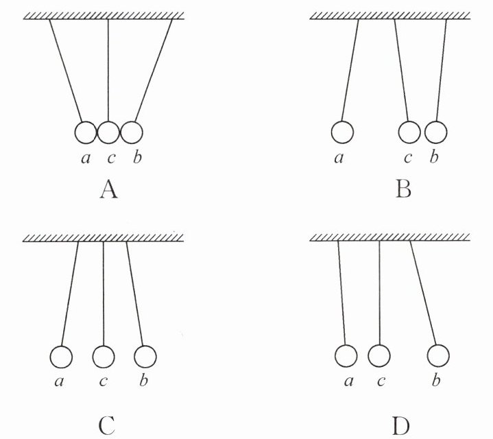 3. 假如自然界存在第三种电荷,且遵循已有的电荷间的作用规律。a、b、c 三个轻质小球分别带正电荷、负电荷和第三种电荷,均用绝缘细线竖直悬挂,相互靠近但始终不接触,三个小球的最终状态可能为(