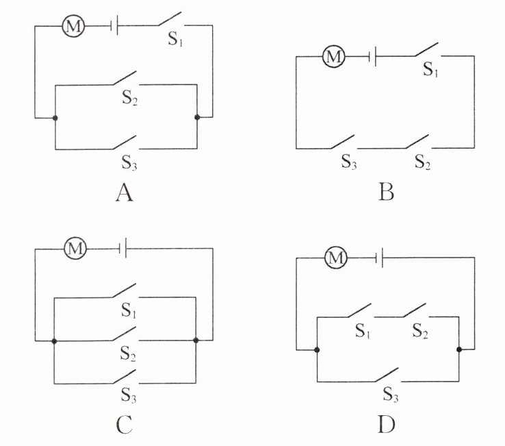 10. 现如今有许多小区在逐渐打造智慧小区,进行智能化管理。小区业主可以用门禁卡$(S_1),$也可以刷脸$(S_2)$进出小区,访客到小区时,业主还可以发送临时密码$(S_3)$给访客进入小区。当任一条件符合时,对应开关闭合,电动机转动,闸门打开。下列图中所示电路,符合上述要求的是(