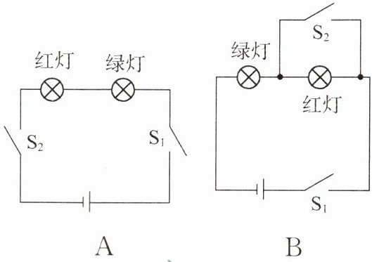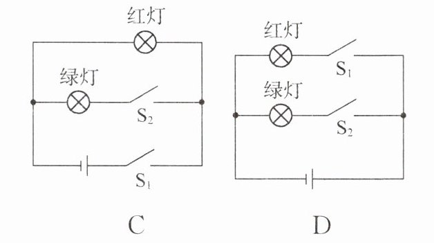 12. “红灯停,绿灯行”是人人都应遵守的交通规则,小明观察人行横道信号灯,发现人行横道信号灯由红灯和绿灯组成,红灯亮、绿灯灭。下列符合人行横道红绿灯的模拟电路图的是(