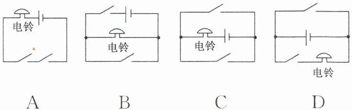 13. 如图所示,公交车后门左右扶杆上各装有一个相当于开关的按钮。当乘客按下任一按钮时,铃声响起,提醒司机有人要下车。图中符合要求的电路是(