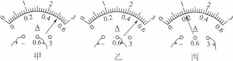 。(3)排除故障后,她将电流表分别串联在 $ L_1 $ 支路、$ L_2 $ 支路和干路上,测出其电流分别为 $ I_1 $、$ I_2 $ 和 $ I $,电流表示数如图甲、乙、丙所示,可读出 $ I_1 = 0.5 A $,$ I_2 = $