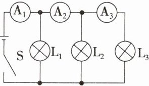例3 如图所示的电路中,当开关S闭合时,电流表 $ A_1 $、$ A_2 $、$ A_3 $ 的示数分别为1.5 A、0.9 A、0.4 A。那么通过灯 $ L_1 $ 的电流 $ I_1 = $