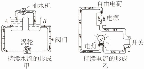$\xrightarrow{形成}$水流,乙图中电源$\xrightarrow{保持}$电压