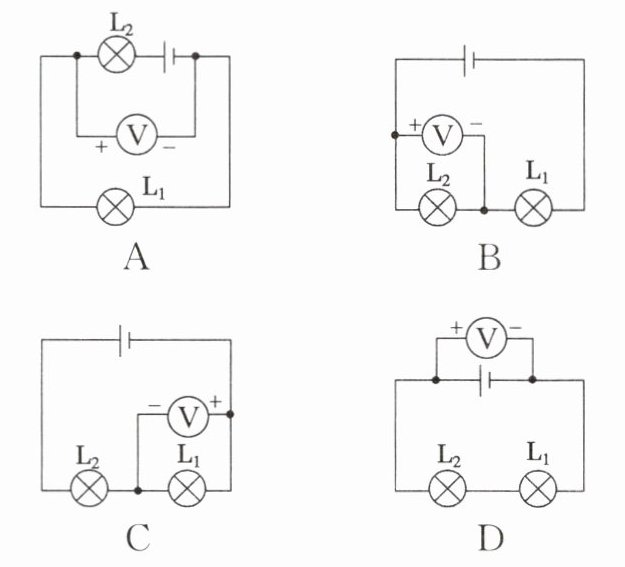 3. 下图所示的四个电路中,为了测量灯$ L_1 $两端的电压,电压表的连接正确的是(