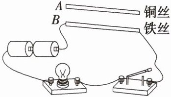 2. 如图所示,A、B导线分别是长短、粗细相同的铜丝和铁丝,把它们分别接入电路,闭合开关后观察小灯泡的亮度(