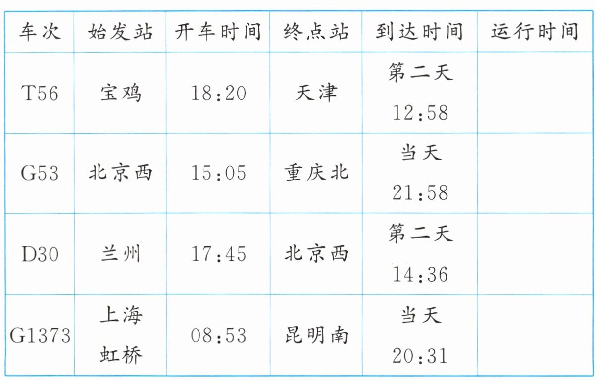 3. 新情境 [真实生活]观察下表,计算出火车运行的时间并填在表中。