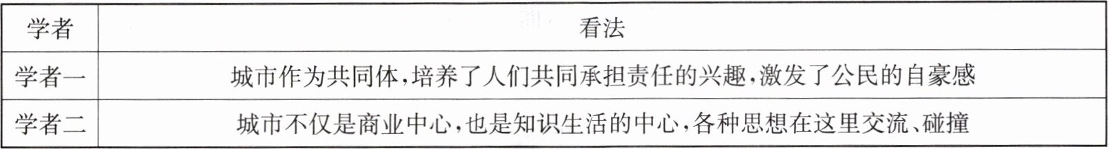 B 解析:表格内容“培养了人们共同承担责任的兴趣,激发了公民的自豪感”“城市不仅是商业中心,也是知识生活的中心,各种思想在这里交流、碰撞”反映的是西欧城市复兴的影响。