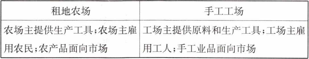 |农场主提供生产工具;农场主雇用农民;农产品面向市场|工场主提供原料和生产工具;工场主雇用工人;手工业品面向市场|