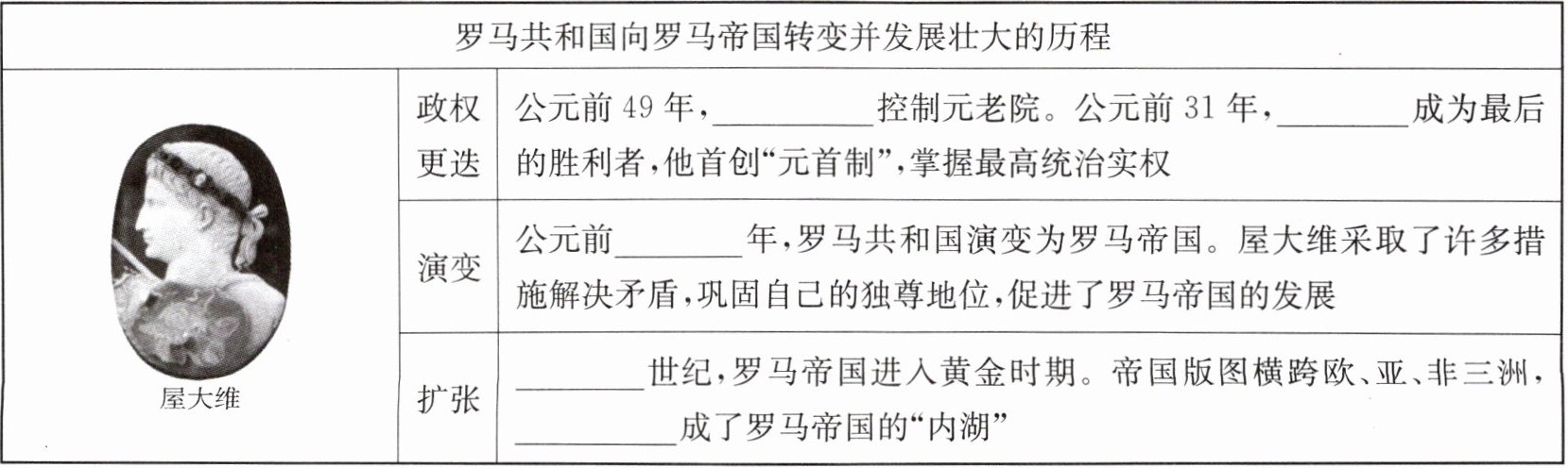 |演变:公元前______年,罗马共和国演变为罗马帝国。屋大维采取了许多措施解决矛盾,巩固自己的独尊地位,促进了罗马帝国的发展|