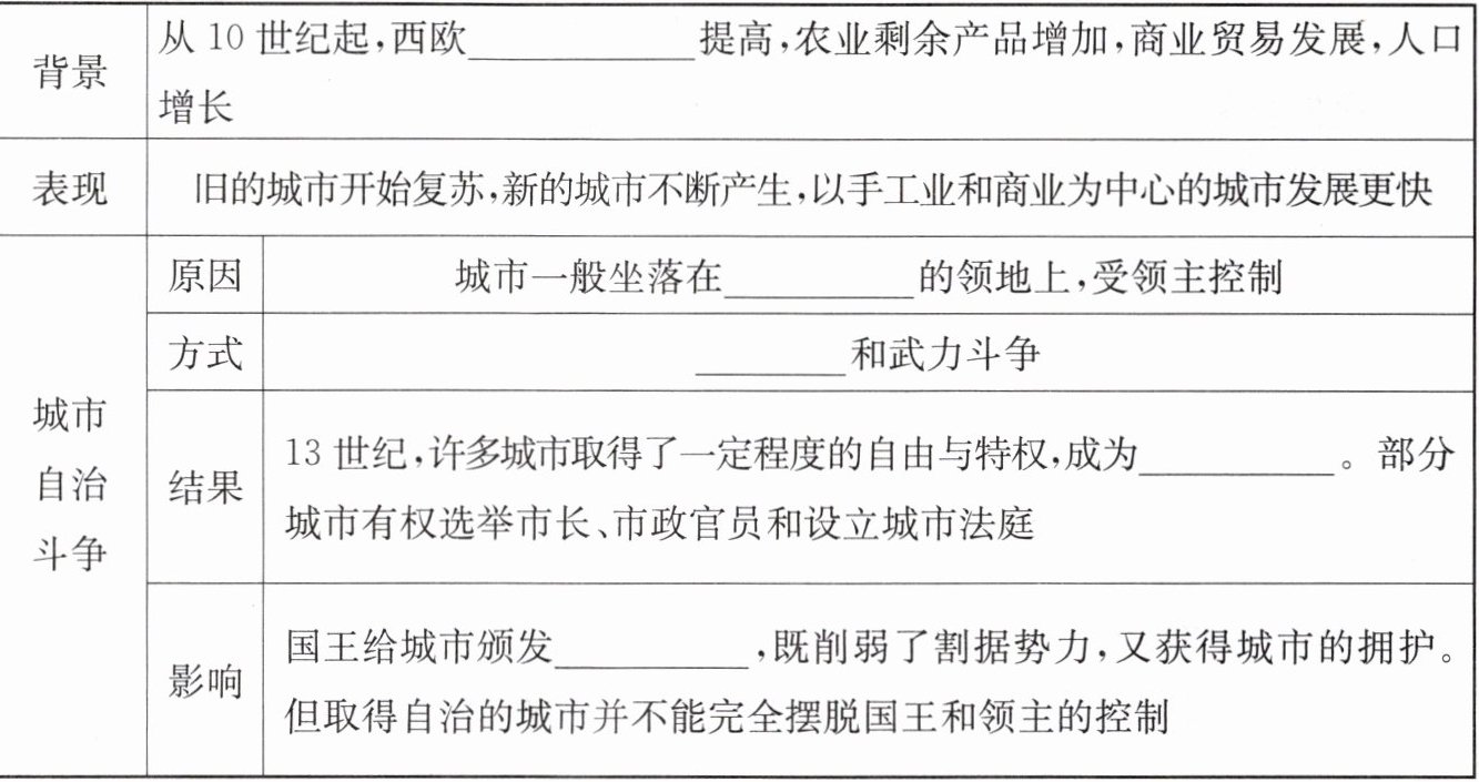 | |背景|从10世纪起,西欧______提高,农业剩余产品增加,商业贸易发展,人口增长|