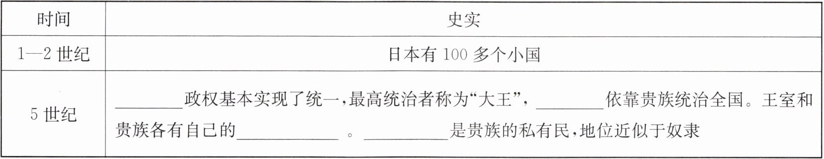 |5 世纪|______政权基本实现了统一,最高统治者称为“大王”,______依靠贵族统治全国。王室和贵族各有自己的______。______是贵族的私有民,地位近似于奴隶|