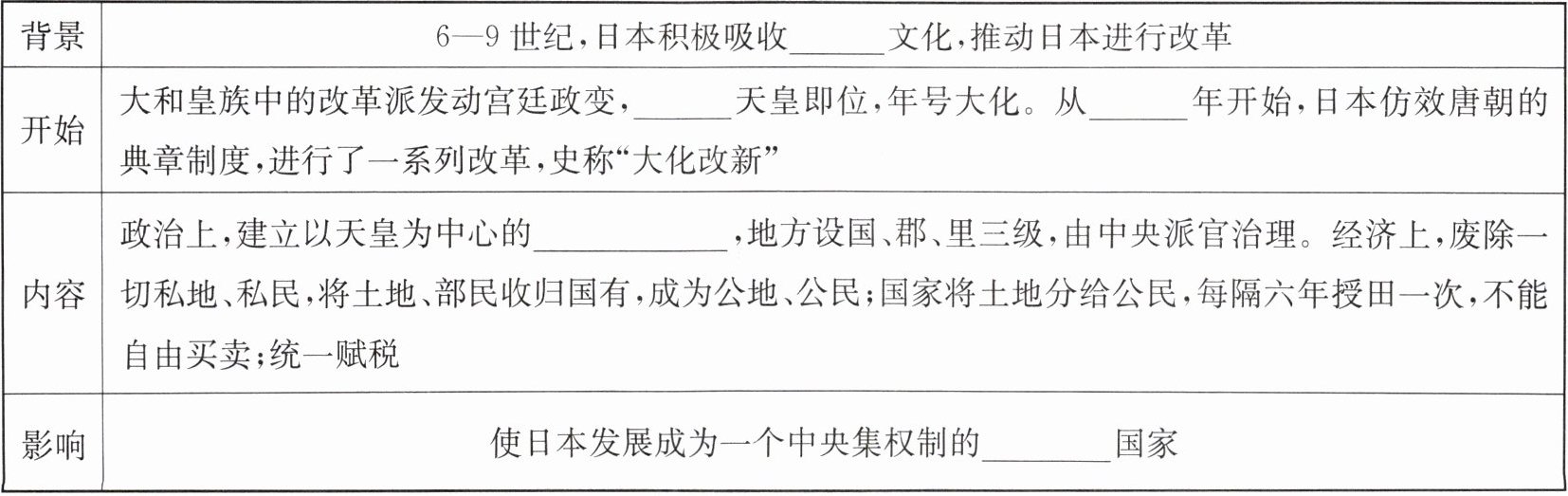 |内容|政治上,建立以天皇为中心的______,地方设国、郡、里三级,由中央派官治理。经济上,废除一切私地、私民,将土地、部民收归国有,成为公地、公民;国家将土地分给公民,每隔六年授田一次,不能自由买卖;统一赋税|