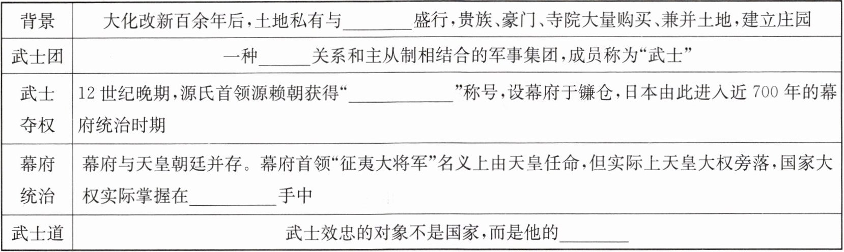 |武士夺权|12 世纪晚期,源氏首领源赖朝获得“______”称号,设幕府于镰仓,日本由此进入近 700 年的幕府统治时期|