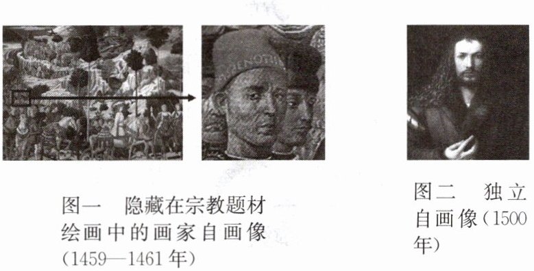 (2)在中世纪的欧洲,画家的形象鲜少出现在画作中,到了文艺复兴时期,自画像大量出现。根据图一、图二的图文信息,指出文艺复兴时期自画像的变化,分析该变化出现的原因。