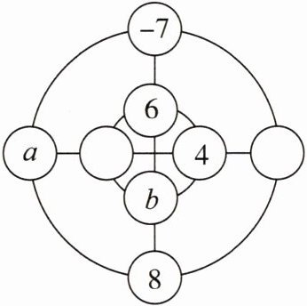 15. 小时候大家喜欢玩的幻方游戏,老师稍加修改变成了“幻圆”游戏,现在将$-1$,2,$-3$,4,$-5$,6,$-7$,8分别填入下图中的圆圈内,使横、竖直线以及内外两圈上的4个数之和都相等,老师已经帮助同学们完成了部分填空,则图中$a + b$的值为______.