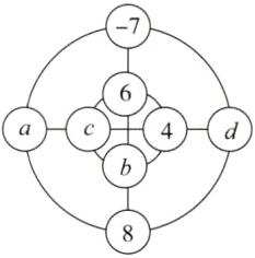 -6或-3 解析:如图,设小圈上未知的数为c,大圈上未知的数为d,-1 + 2 - 3 + 4 - 5 + 6 - 7 + 8 = 4.因为横、竖直线以及内外两圈上的4个数之和都相等,所以内外两圈上的4个数的和都是2,横、竖直线上的4个数的和也都是2.