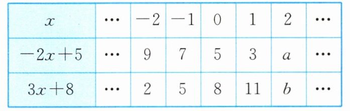 (2)表中$-2x+5$的值的变化规律:x的值每增加1时,$-2x+5$的值就减少2.$3x+8$的值的变化规律:x的值每增加1时,$3x+8$的值就增加3.故答案为2;x的值每增加1时,$3x+8$的值就增加3.