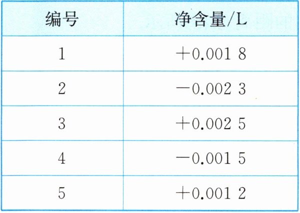 9. 某企业生产瓶装食用调和油,根据质量要求,净含量(不含包装)允许有$0.002\ L$误差。现抽查$5$瓶食用调和油,超过规定净含量的体积记作正数,不足规定净含量的体积记作负数。检查结果如下表: