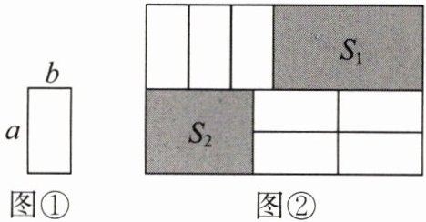 (2) 如图①所示,有 7 张长为$a$,宽为$b$的小长方形,按照图②的方式不重叠地放在大长方形内,大长方形中有未被覆盖的两部分(图中阴影部分),设右上角阴影部分的面积为$S_{1}$,左下角阴影部分的面积为$S_{2}$,当大长方形的长发生变化时,$S_{1}-S_{2}$的值始终保持不变,求$a与b$的数量关系。