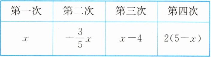 解:$x+(-\frac{3}{5}x)+(x-4)+2(5-x)=-\frac{3}{5}x+6$.因为当$x=15$时,$-\frac{3}{5}x+6=-\frac{3}{5}×15+6=-3$,所以经过连续四次行驶后,这辆出租车在A地的西边,距离A地3km.