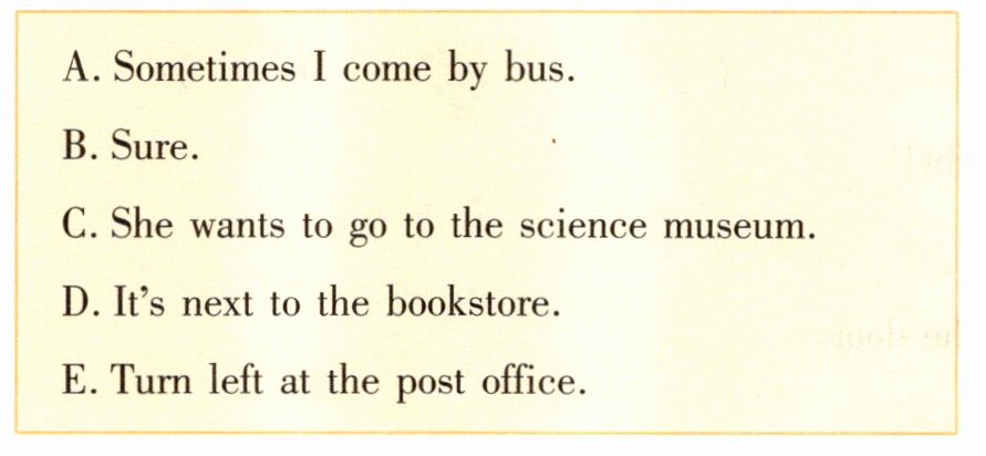 1. How do you come to school? 2. How can I get to the post office? 3. Where is the science museum? 4. She usually goes by bike. 5. Mrs Smith sometimes takes the No. 25 bus.