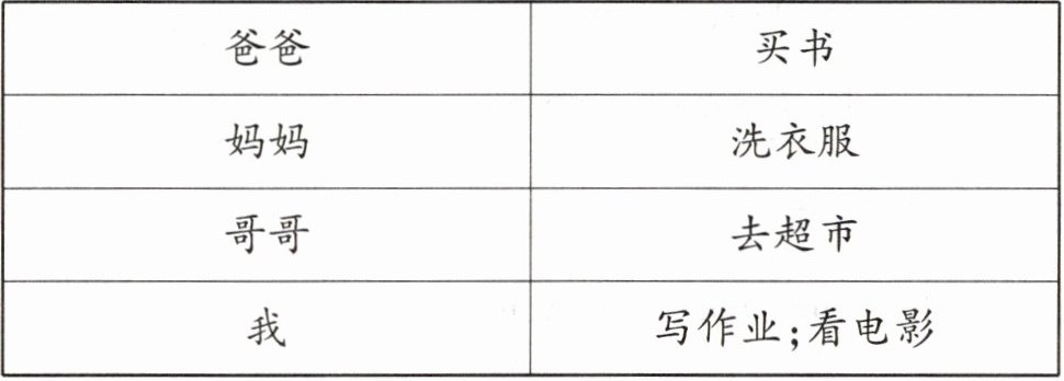 根据下面的表格内容写一写你的家庭成员们的周末计划吧!不少于5句话。