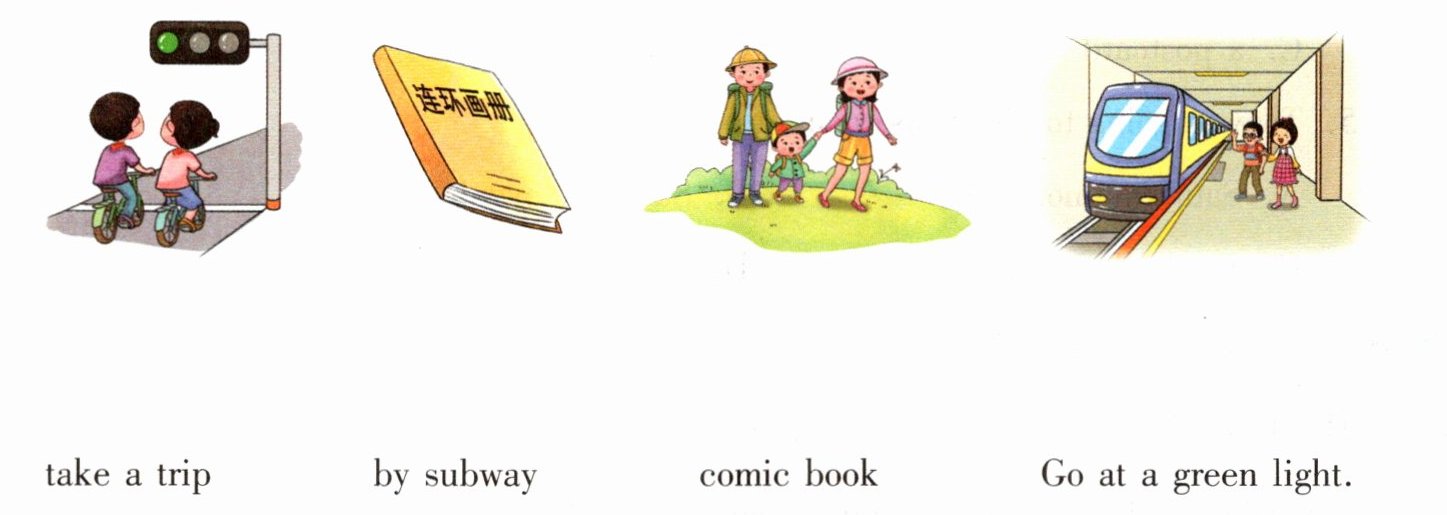 第一幅图连Go at a green light.;第二幅图连comic book;第三幅图连take a trip;第四幅图连by subway。