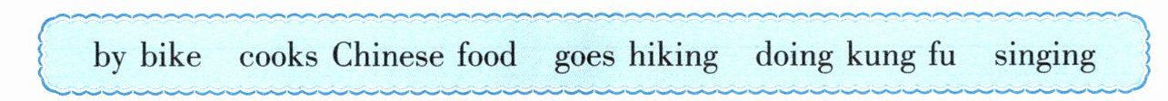 1. doing kung fu 2. by bike 3. singing 4. goes hiking 5. cooks Chinese food
