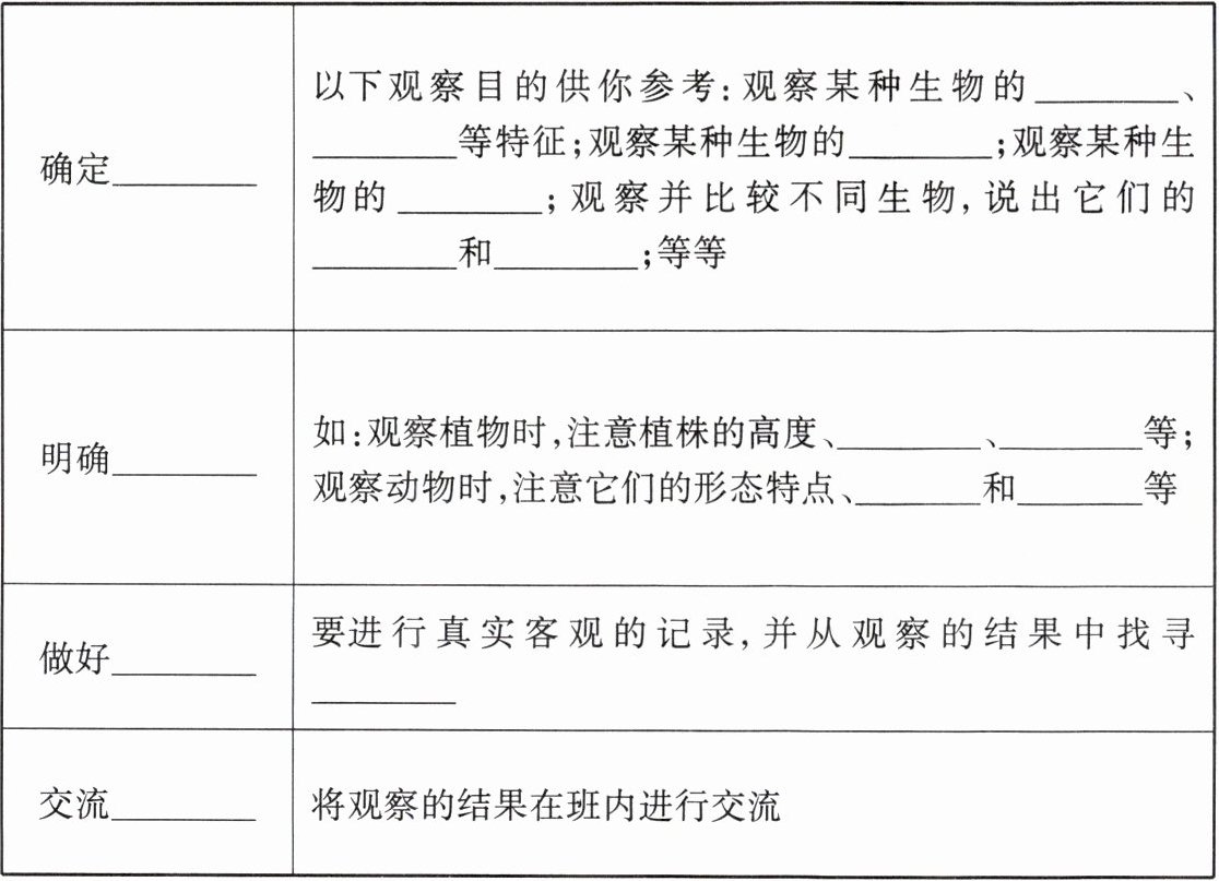 观察目的 形态 结构 生活环境 生活习性 相同点 不同点 观察对象 形态 生长环境 运动方式 生活环境 观察记录 规律 观察结果