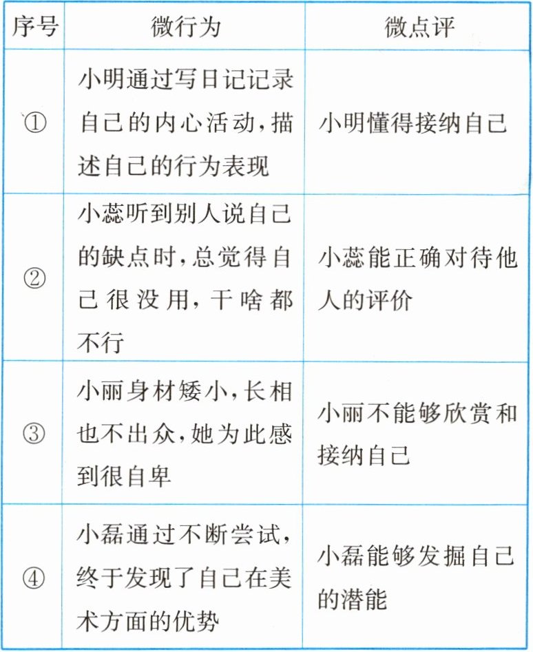 |①|小明通过写日记记录自己的内心活动,描述自己的行为表现|小明懂得接纳自己|