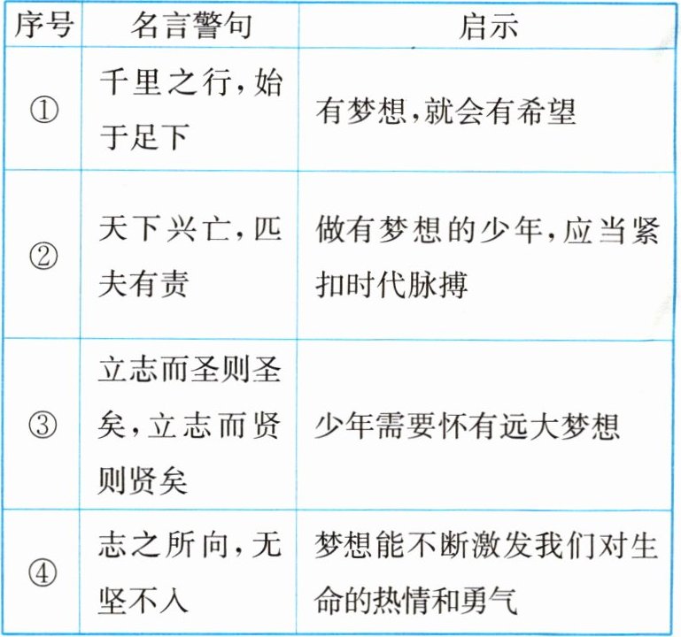 (1)①编织人生梦想,是青少年时期的重要主题,它能不断激发我们对生命的热情和勇气,让生活更有色彩。②因为有了梦想,人类社会才能不断发展和进步。③做有梦想的少年,应当树立远大志向。④做有梦想的少年,应当紧扣时代脉搏。