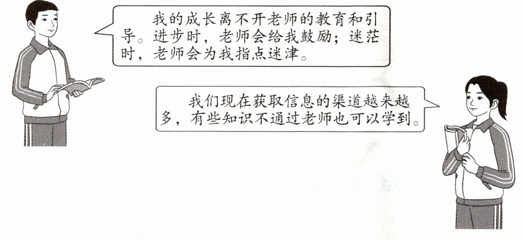 (2)我同意男孩的观点,不同意女孩的观点。因为老师在我们的成长过程中发挥着不可替代的作用。虽然我们现在获取信息的渠道越来越多,但教师的作用不可替代。老师不仅仅是我们学习知识的引路人,而且对我们锤炼品格、开启创新思维、立志奉献祖国都有重要作用。