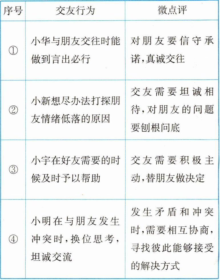 |①|小华与朋友交往时能做到言出必行|对朋友要信守承诺,真诚交往|