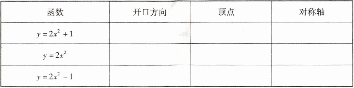 1. 观察教材第 32 页二次函数 $ y = 2x^2 + 1 $,$ y = 2x^2 $,$ y = 2x^2 - 1 $ 的图象,填表: