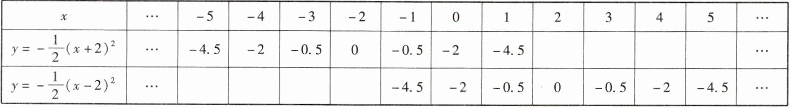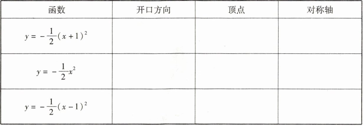 2. 观察教材第 34 页二次函数 $ y = -\frac{1}{2}(x + 1)^2 $,$ y = -\frac{1}{2}x^2 $,$ y = -\frac{1}{2}(x - 1)^2 $ 的图象,填表: