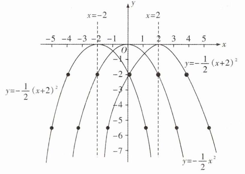 然后描点画图,得 $ y = -\frac{1}{2}(x + 2)^2 $,$ y = -\frac{1}{2}(x - 2)^2 $ 的图象(如图)。