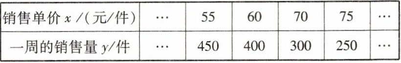 2. 某商家独家销售具有地方特色的某种商品,每件进价为40元. 经过市场调查,一周的销售量y(件)与销售单价x(元/件)$ ( x \geq 50 ) $的关系如下表: