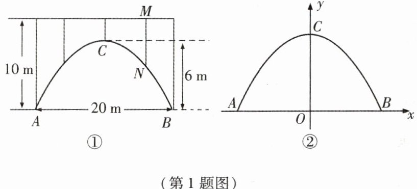 1. 一座拱桥的轮廓是抛物线(如图①所示),拱高 $ 6 $ m,跨度 $ 20 $ m,相邻两支柱间的距离均为 $ 5 $ m.
