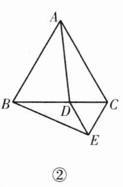例2 如图①,△ABC 是等边三角形,D 为 BC 边上一点,△CDE 也是等边三角形,请你画出将△ACD 以 C 为旋转中心、逆时针方向旋转 60°后的三角形。你能发现线段 AD 与线段 BE 有何关系吗?