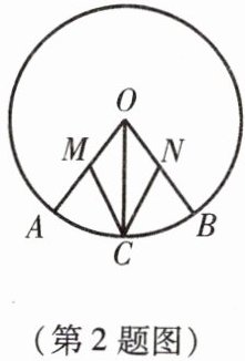 2. 如图,已知$OA$,$OB$,$OC是\odot O$的三条半径,$\angle AOC = \angle BOC$,$M$,$N分别是OA$,$OB$的中点,那么$MC与NC$相等吗?为什么?