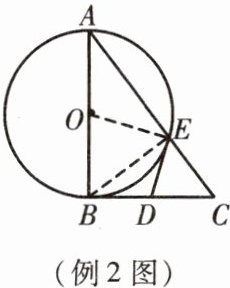 例2 如图,$\triangle ABC$是直角三角形,$\angle ABC = 90^{\circ}$,以$AB为直径的\odot O交AC于点E$,点$D是BC$边的中点,连接$DE$.