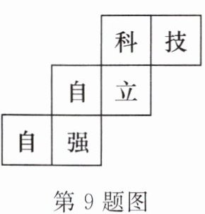 9. (2024·宿迁)全国两会,习近平总书记在参加江苏代表团审议时指出,我们能不能如期全面建成社会主义现代化强国,关键看科技自立自强.将“科技、自立、自强”六个字分别写在某正方体的表面上,如图,这是它的一种表面展开图.在原正方体中,与“强”字所在面相对的面上的汉字是 (