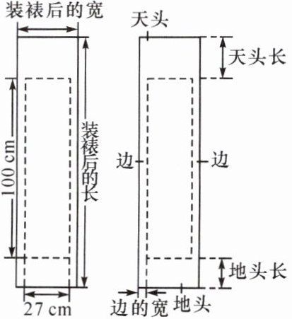 解:设天头长为$6x\ cm$,地头长为$4x\ cm$,则左、右边的宽为$x\ cm$.根据题意,得$100+(6x+4x)=4×(27+2x)$,解得$x=4$,则$6x=24$.答:边的宽为$4\ cm$,天头长为$24\ cm$.
